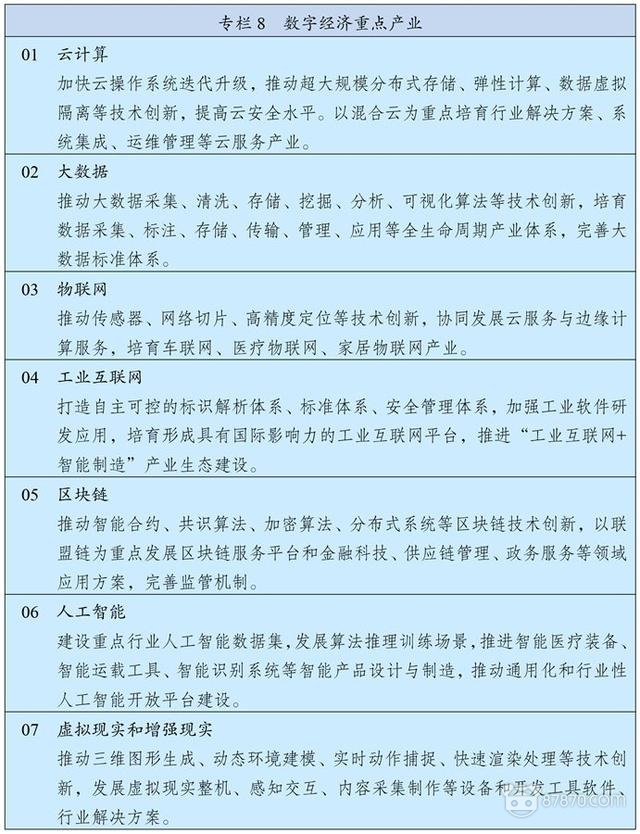 培育壯大人工智能、大數據、區塊鏈、云計算、網絡安全等新興數字產業,提升通信設備、核心電子元器件、關鍵軟件等產業水平。構建基于5G的應用場景和產業生態,在智能交通、智慧物流、智慧能源、智慧醫療等重點領域開展試點示范。鼓勵企業開放搜索、電商、社交等數據,發展第三方大數據服務產業。促進共享經濟、平臺經濟健康發展。